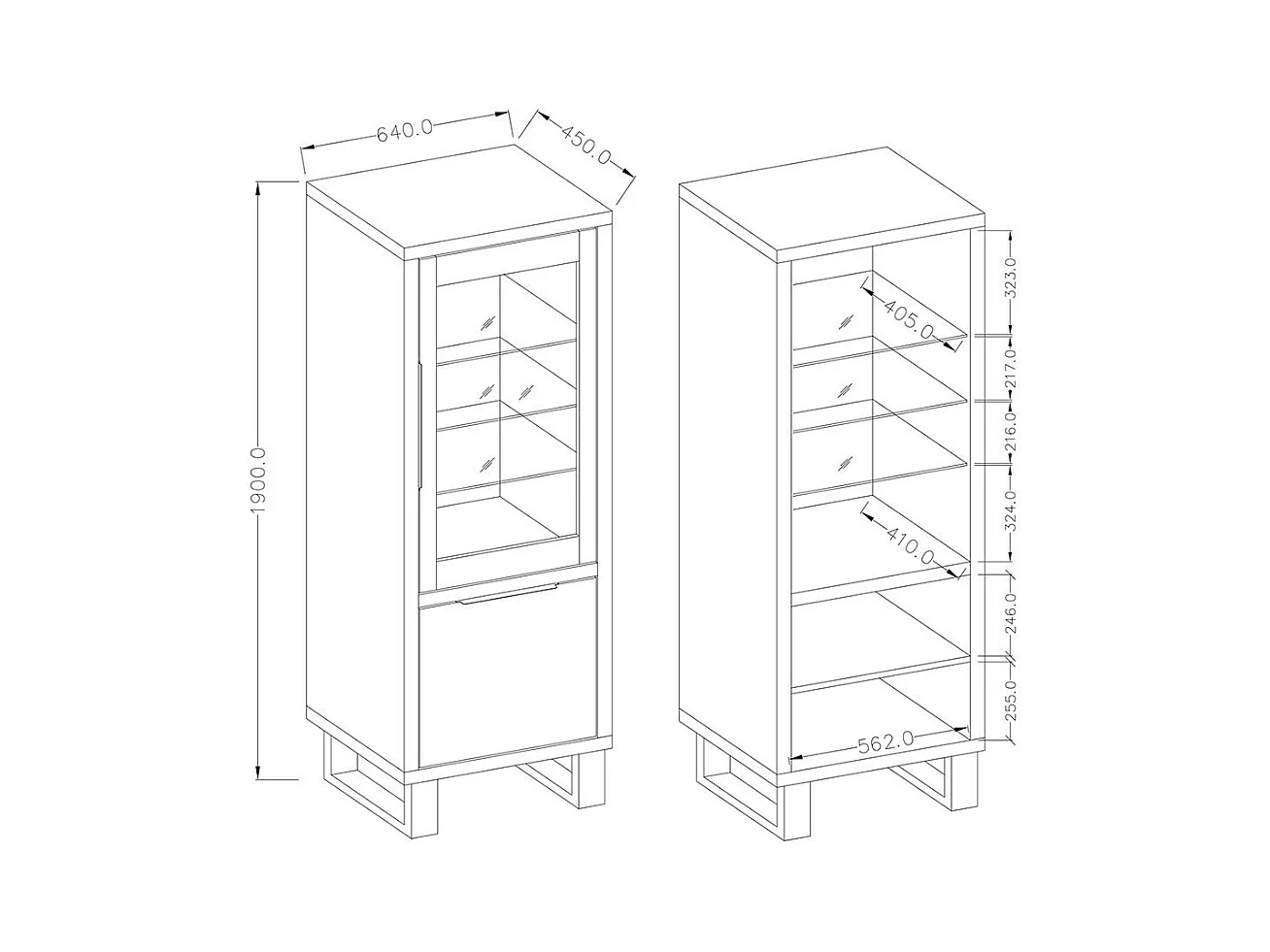 Vitrina alta design com 1 porta coleção SANTIAGO. Cores em carvalho e preto com efeito madeira.