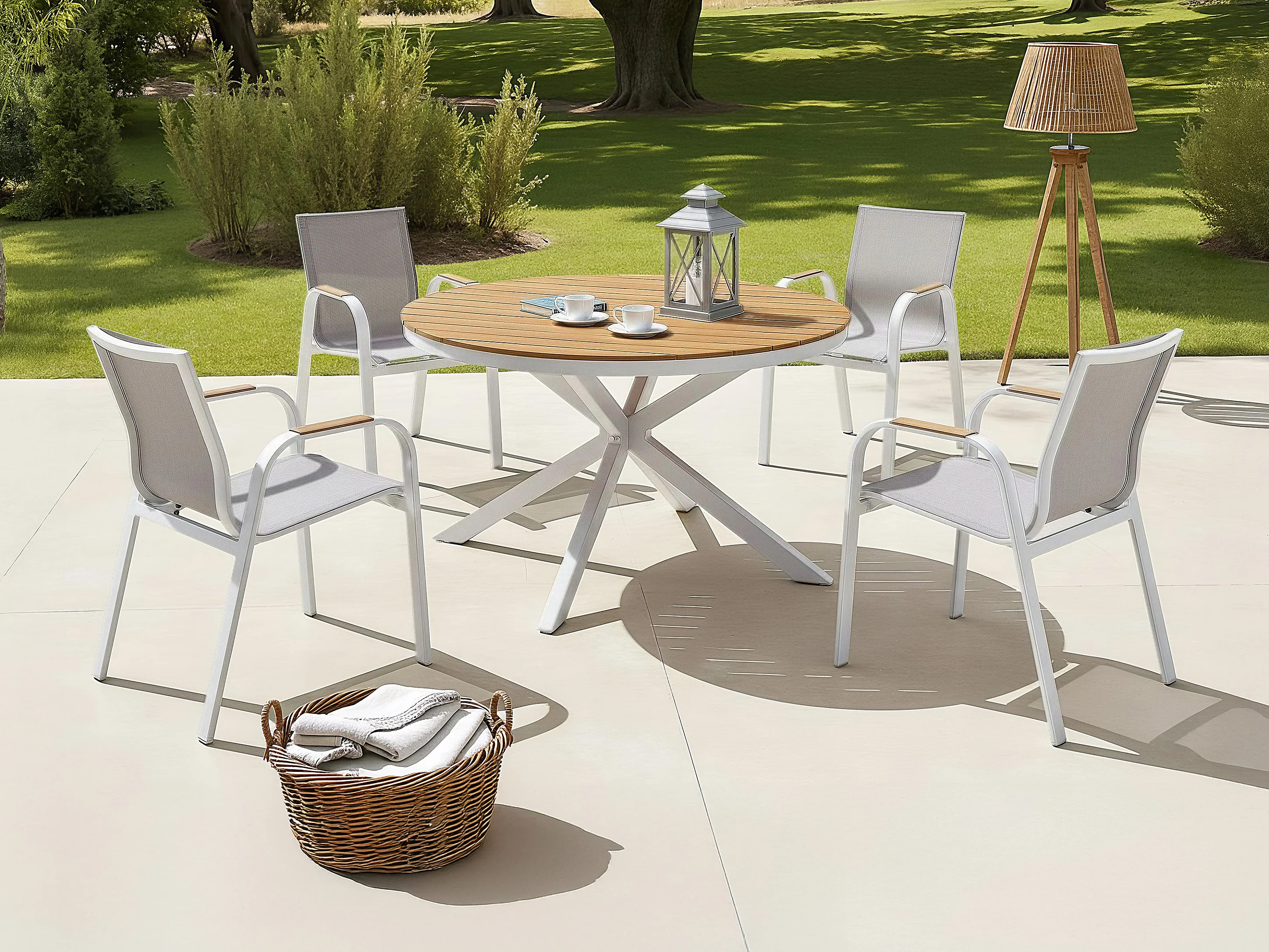 Conjunto de sala de jantar de jardim em alumínio: mesa redonda D.125 cm e 4 poltronas - Branco e natural claro - ZEYVA da MYLIA