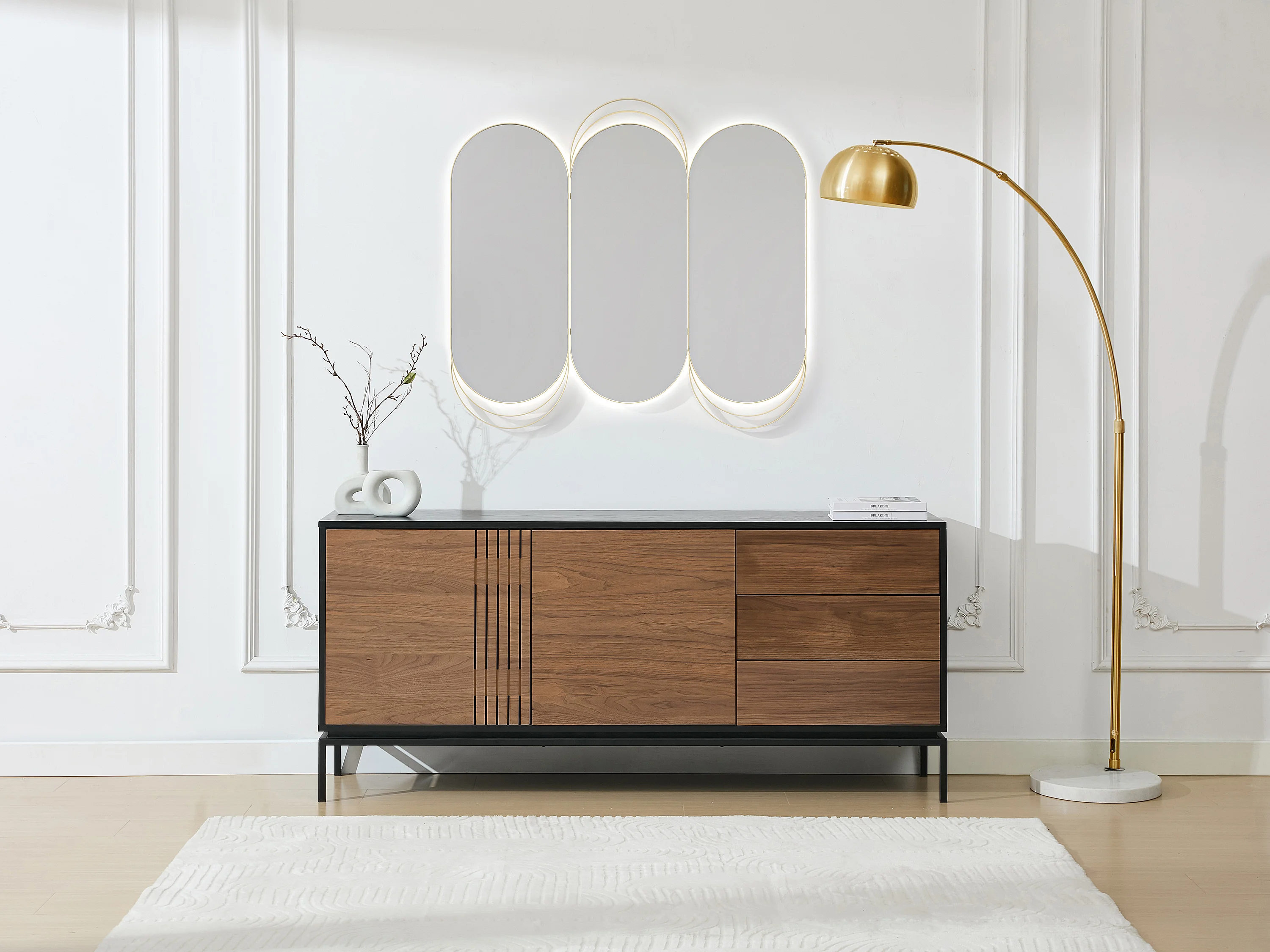 Aparador com 2 portas e 3 gavetas folha de nogueira e metal natural escuro e preto - ZINORI